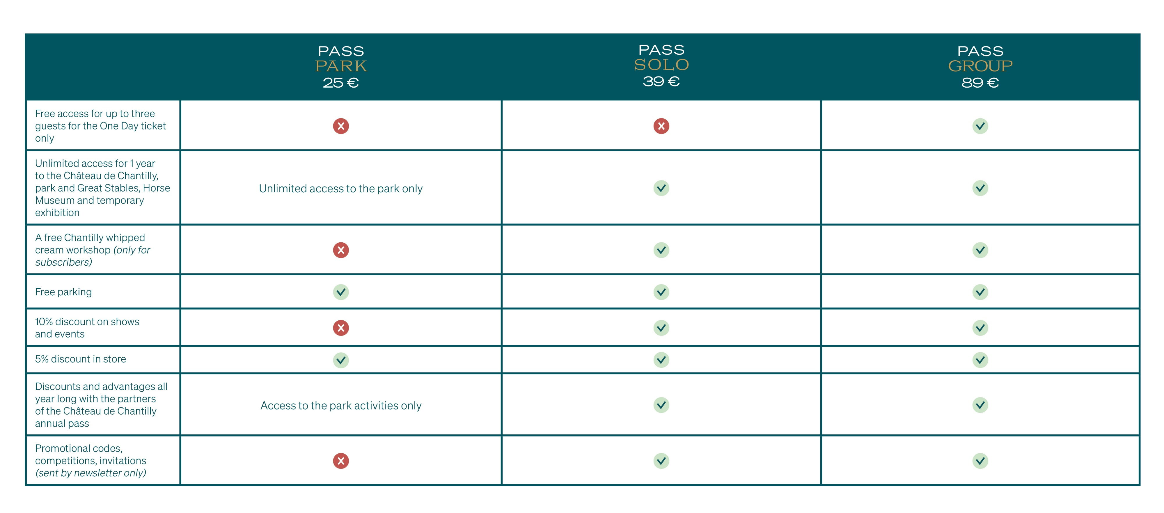 ** The events concerned are: The Journées des Plantes (on-site purchase, on presentation of Solo pass solo or Tribu pass), the White Picnic (on-site purchase, on presentation of Solo pass solo or Tribu pass) and the Halloween's visits by torchlight (byvreservation at reservations@chateaudechantilly.fr or 03 44 27 31 58. You will need to submit your Solo or Tribu pass at the entrance).