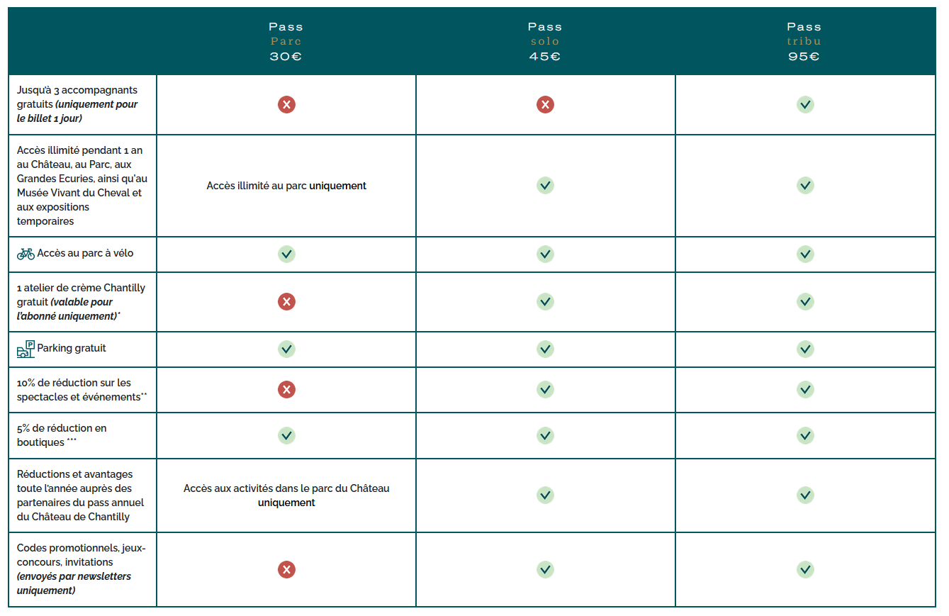 ** Les événements concernés sont : les Journées des Plantes (achat sur place, sur présentation du pass solo ou tribu), le pique-nique en blanc (achat sur place, sur présentation du pass solo ou tribu) et les visites à la lampe torche d’Halloween (sur réservation à publics@chateaudechantilly.fr). La présentation de votre pass solo ou tribu vous sera demandé au contrôle des billets.